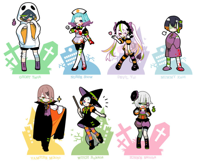 一束がデザインを担当した個人Vtuber達のハロウィン衣装SDイラストです。