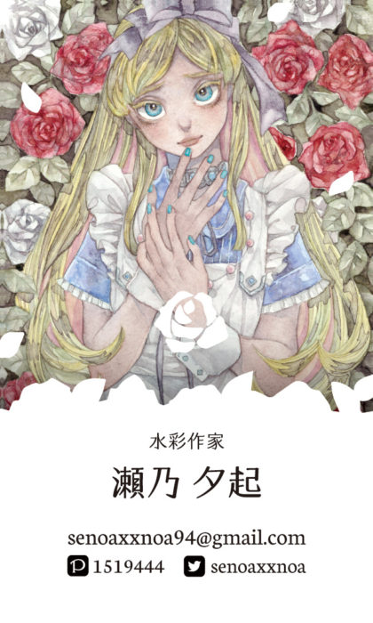 水彩作家の瀬乃夕起様の名刺をデザインさせていただきました。イラストの印象を損なわないよう、かつ情報が読み取りやすいように、イメージに合わせたフレーム等で仕上げています。